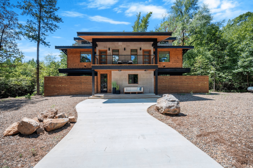 An exquisite blend of materials highlights Enchanted Creeks’ aesthetic appeal, from the stone fireplace and floor-to-ceiling slat wall to the floating staircase, teak accents, modern sconces, and hardwood floors. The generous number of windows welcomes the beauty of the outdoors inside, flooding the space with natural light and providing ample seating for relaxation or quality time with loved ones. Designer touches enhance the comfort of the seating, creating a perfect setting for unwinding and savoring the day’s offerings. Additionally, a conveniently placed guest bathroom is just steps away from the living and kitchen areas.