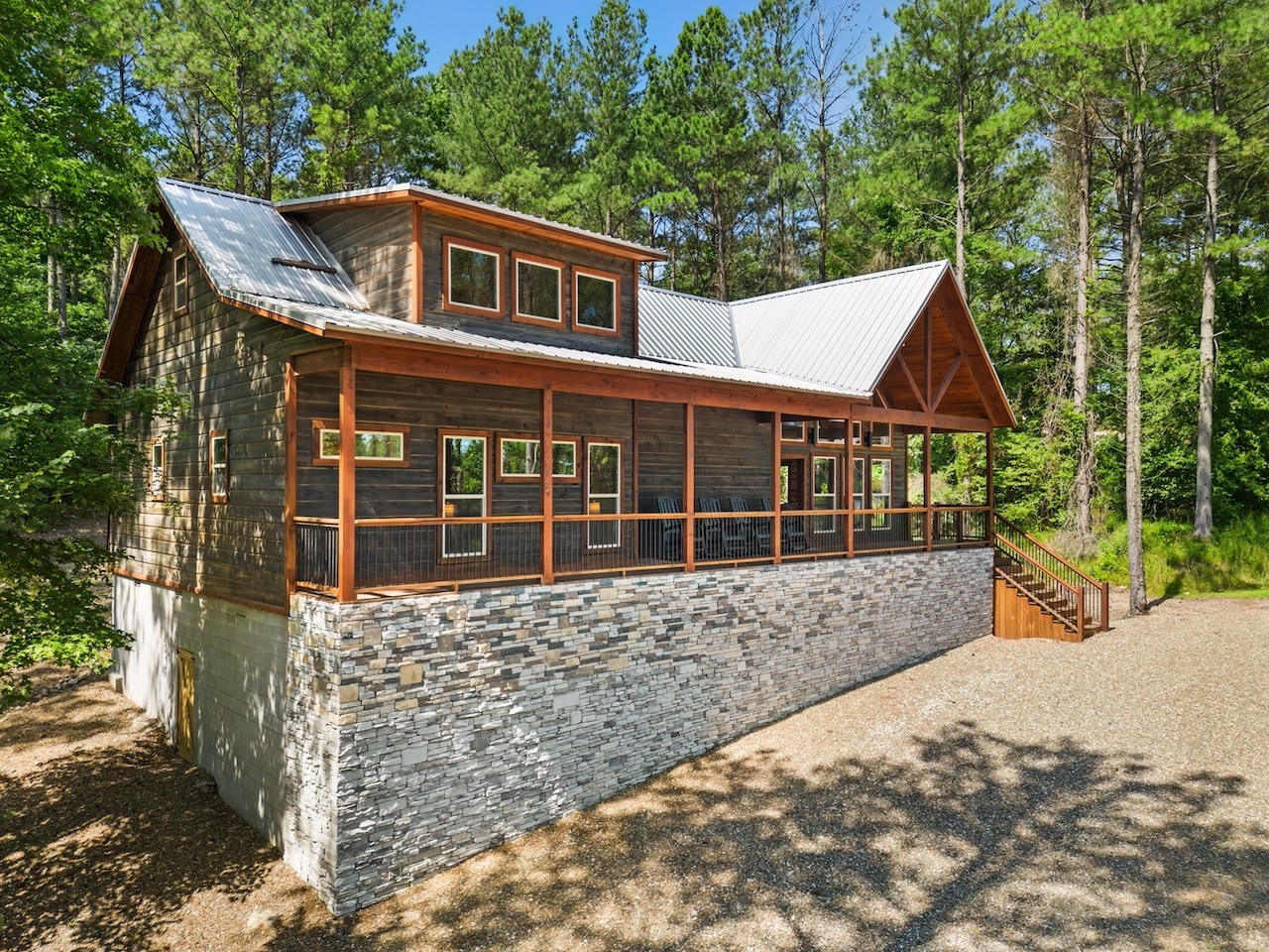 A Peak Experience is a spacious 3-bedroom cabin located on a corner lot Of Redberry and Grape. The living area has Sectional seating in front of a gas burning fireplace (seasonal October 1st – May 1st). The TV is mounted above the fireplace and features a Smart TV for your app usage. The open space kitchen is equipped with dishwasher, microwave and glass cook top stove with electric oven. The cabinets are stocked with dinnerware, eating utensils, cookware, and bake ware. The dining table seats 8. Additional seating is provided at the island with stools. Down the hallway are 2 master suite bedrooms with king bed, a cabinet for storage of personal items, Smart TV and private bath. The bathrooms have oversized walk-in tile showers and single vanity. A second bedroom is located next to this bedroom and mirrors the amenities. Also located in the hallway is a private office room with a desk and chair; the laundry closet with full size washer and dryer are also located in the hallway. The upstairs area has a common area with sofa seating, foosball, and a Smart TV. The third bedroom is located upstairs and has a king suite and a Smart TV. There is a chest of drawers for storage of personal items. A full bathroom is upstairs with a tub/shower and single vanity. The game room/loft has additional sleeping for 5 with a sofa bed, twin bunks, and a trundle. Out on the back deck there is seating in front of the gas log fireplace (seasonal October 1st – May 1st). There is a propane cook grill with propane provided. The hot tub sits in an alcove of the deck area. There is a Smart TV mounted above the fireplace. There is a dining table outside to enjoy meals. Down the step to the gravel grounds there is a circular fire pit for roasting marshmallows and enjoying a wood fire. The circular drive allows for easy pull-through of trailers.