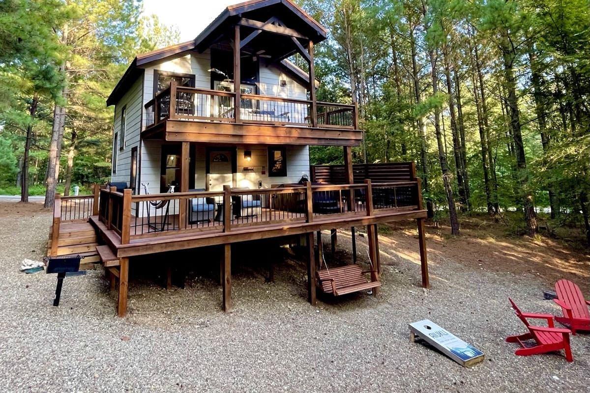 Nestled in the tall pines of Timber Creek Trails lies Aiukli Pine View Cabin, a cozy, rustic, barn-house design with modern furniture for the perfect romantic getaway, a small family, or a small group up to 4 people. This cabin has personality! From the minute you pull up, you will see the amazing trees and extra large decks that provide plenty of outdoor living. With a natural setting, this cabin has many built in luxuries. Imagine opening your bedroom’s french doors to step out to the upstairs covered deck and enjoy the sunrise or sunset on a day-bed swing. You’ll love the natural stone walk-in shower with gentle rainfall shower head, and the corner tub in the bedroom. The bedroom has a king bed in front of the French doors, situated for the best views.