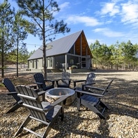 Beautiful AF is the perfect luxury cabin for families or couples looking to enjoy a relaxing getaway in Broken Bow. This stunning cabin is sure to bring the “wow” factor for even the most discerning guests with gorgeous vaulted ceilings, oversized windows everywhere, a modern chef’s kitchen, 1 king master suite with ensuite bathroom and second upstairs room with Queen bunk beds and a large outdoor living space.