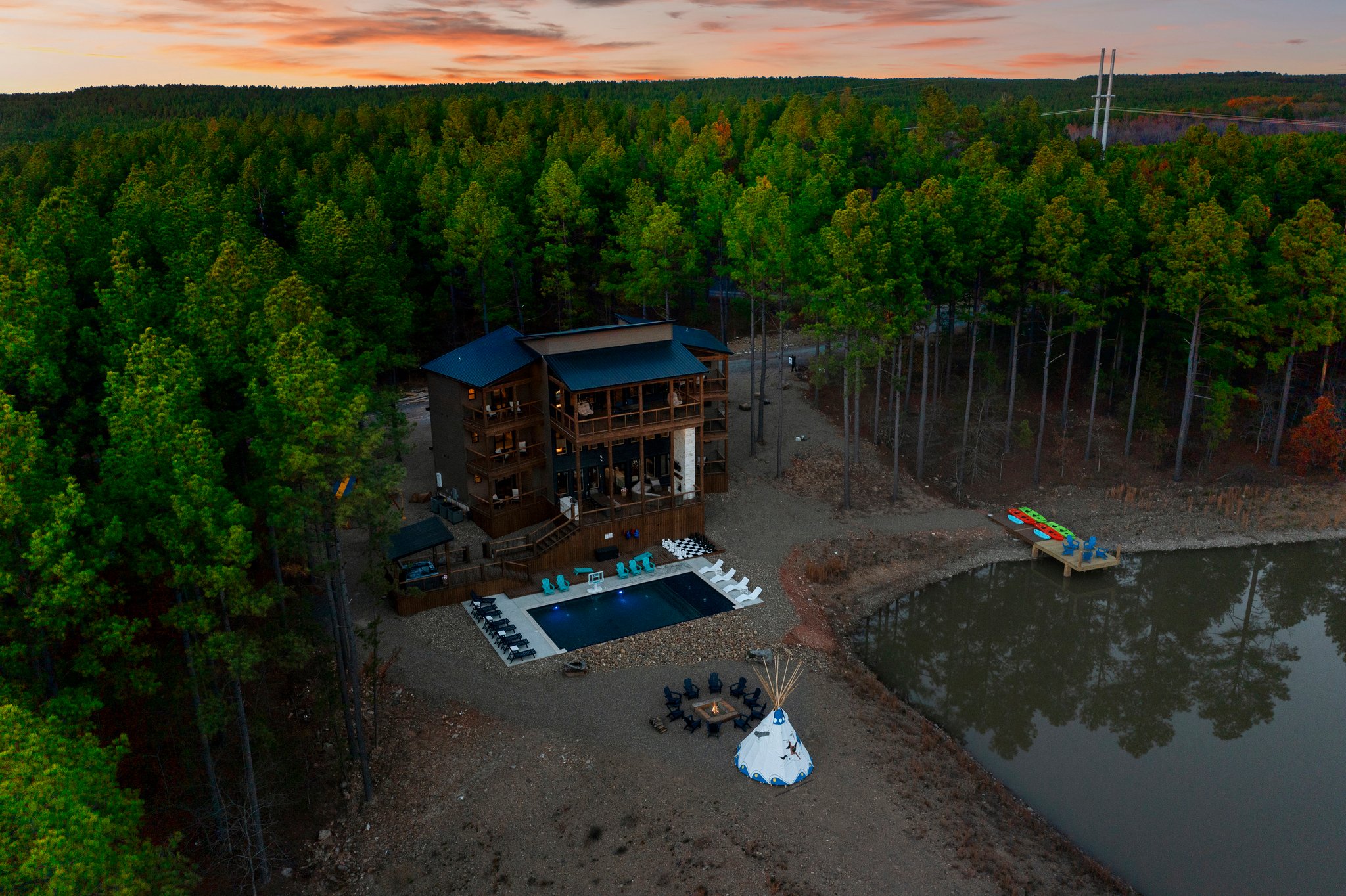 Welcome to the Haus family’s 5th privately owned cabin, Boat Haus at Boulder Lake, professionally managed by Bravo Cabin Rentals. Endless activities are just a fingertip away—whether it’s diving into a world of interactive games in your own arcade room or shooting hoops in the heated pool. Imagine jumping from the hot tub into your private stocked fishing pond, playing frisbee golf, hitting golf balls at the tee box into the pond, or sinking into the soothing warmth of the hot tub while taking in the breathtaking view of towering 90-foot pine trees. Spend hours hanging out around the fire pit with a custom-made teepee, sharing stories and laughter. Then, wake up to a steaming cup of coffee on your private balcony, overlooking the serene pond. It’s the perfect setting to enjoy with your closest 12-30 friends and family, all gathered in one unforgettable place. The living room features two spacious sectional couches, each paired with its own extra-large TV for the ultimate comfort and viewing experience. Perfect for everyone in the cabin to watch the Super Bowl together! Need a few cooks in your kitchen? We have you covered, along with just about every cooking amenity you may need. There is room for everyone to eat between the custom-made blue water epoxy dining room table, kitchen island bar, outdoor dining room table, third-floor mini bar table, 4 pub height tables, and the 3rd-floor outdoor seating table. Bring your ATVs and hit the trails from the front door of the cabin! No need to trailer them anywhere