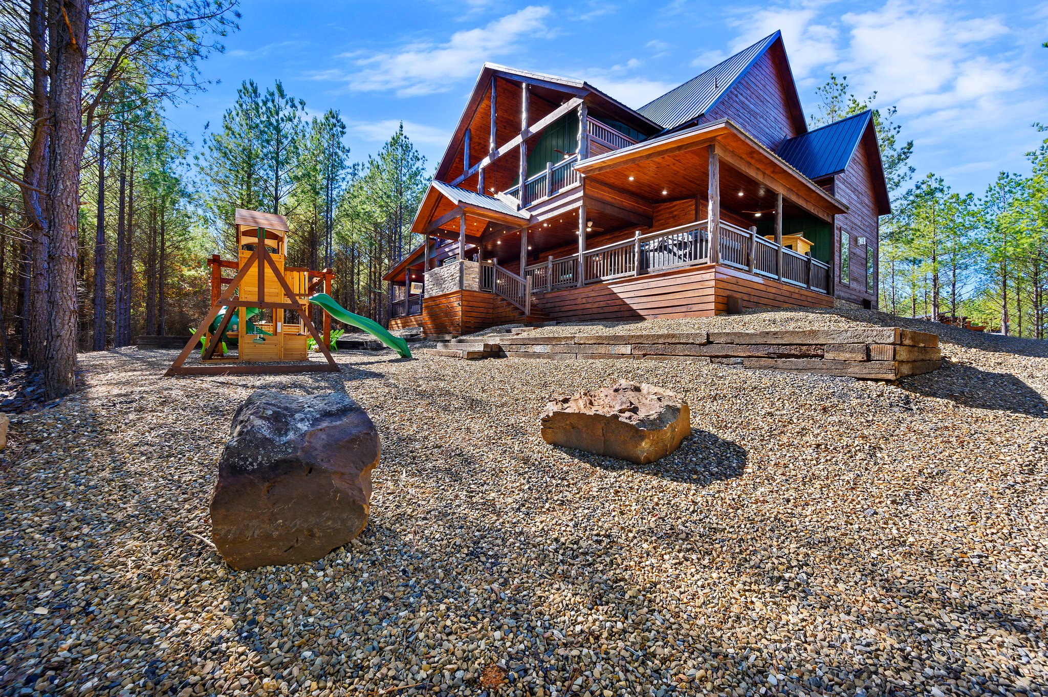 Nestled in seclusion, this cabin offers a gravel fire pit area and a large lot, allowing you to immerse yourself in the beauty of nature. The gravel circle driveway with boat parking ensures convenience and accessibility. And for those who can’t bear to leave their furry friends behind, “Bourbon Sunset” is pet-friendly, with office approval required for pets over 25 lbs. Experience luxury and serenity like never before at “Bourbon Sunset.”