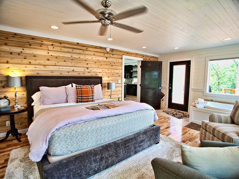 The master bedroom’s huge windows provide breathtaking views of the river. Two comfy sitting chairs, a beautiful king size bed, and a jacuzzi for two make this romantic room special. The kitchen area with unique, earthy quartz countertops, includes an island bar and all the items you would expect in a gourmet kitchen. The windows below the cabinets enable the chef to enjoy river views even while cooking!