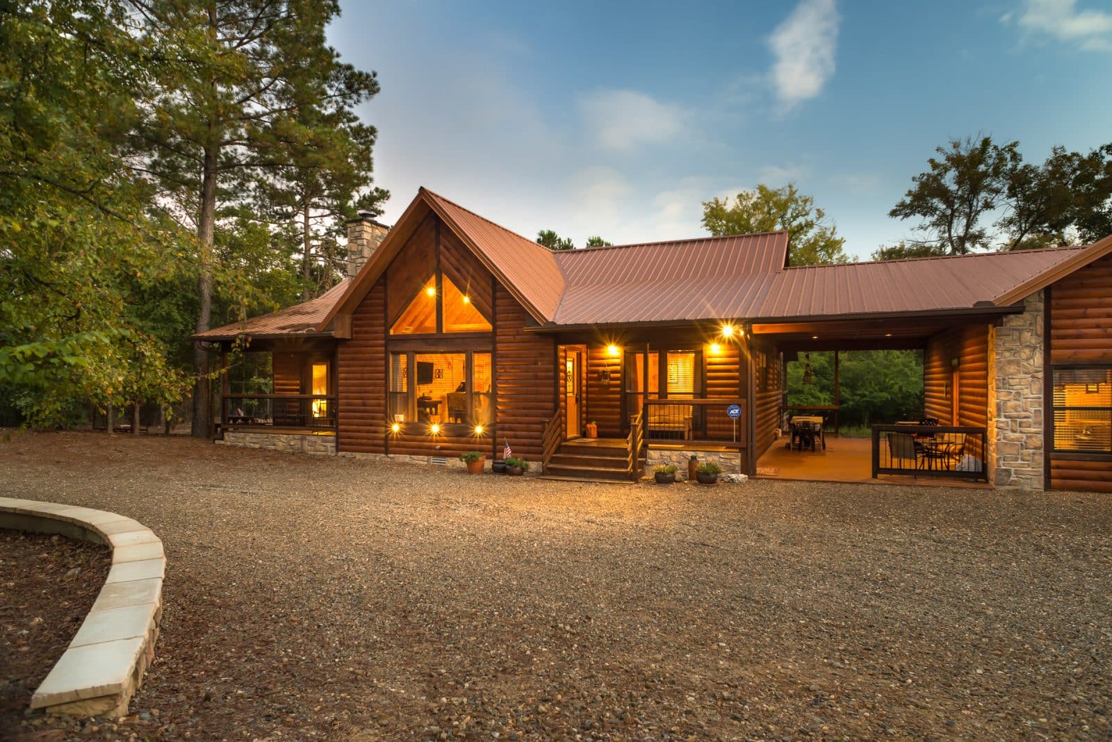 Sleeps 8 – This spacious, open concept cabin with cathedral ceilings offers a bright welcome to visitors. The cabin is a 3 bedroom, 3.5 bath cabin with a 600 sq ft. media and game room separated by a covered breezeway. In the game room there are 1 queen pullouts, half bath, wet bar, shuffleboard and pool table. Boasting a 60″ television and Dish Network, this addition is great for those family game nights. The large back deck overlooks a seasonal gently moving creek, the soft trickling a perfect addition to enjoying the stars while soaking in the large hot tub. The cabin also offers a washer and dryer, wood burning fireplace, granite countertops, WiFi, DVD player, a television in every bedroom, outdoor playset, charcoal grill, and firepit.