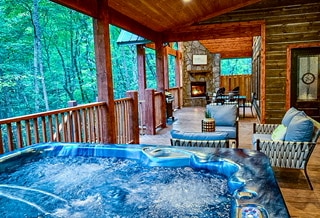 One of the most attractive features of Couples Cabin on the Creek is the large covered back deck. Enjoy the therapeutic 5 person hot tub, gas grill (propane included), dining table for 4, or one of the two sitting/lounge areas. The back deck lights have dimmer switches so you can create the perfect ambience to fit your mood.