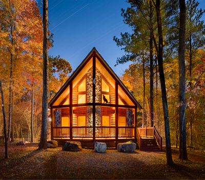 This is a roomy, two bedroom cabin. It is two storied, with two baths and vaulted living areas. It portrays a rustic aura with yellow pine paneling, blue stain pine ceilings, beautiful circle-sawn oak floors, and rock fireplace. The living area is spacious. The bedroom furniture and tables are handmade and beautifully crafted from native Eastern Cedar logs. The kitchen has all the cookware, utensils, dinnerware and appliances of a typical home in addition to an outside propane grill. A large HDTV is located in the living area and a smaller one in the bedroom. You’ll be delighted with the ease of an auto-light fireplace.