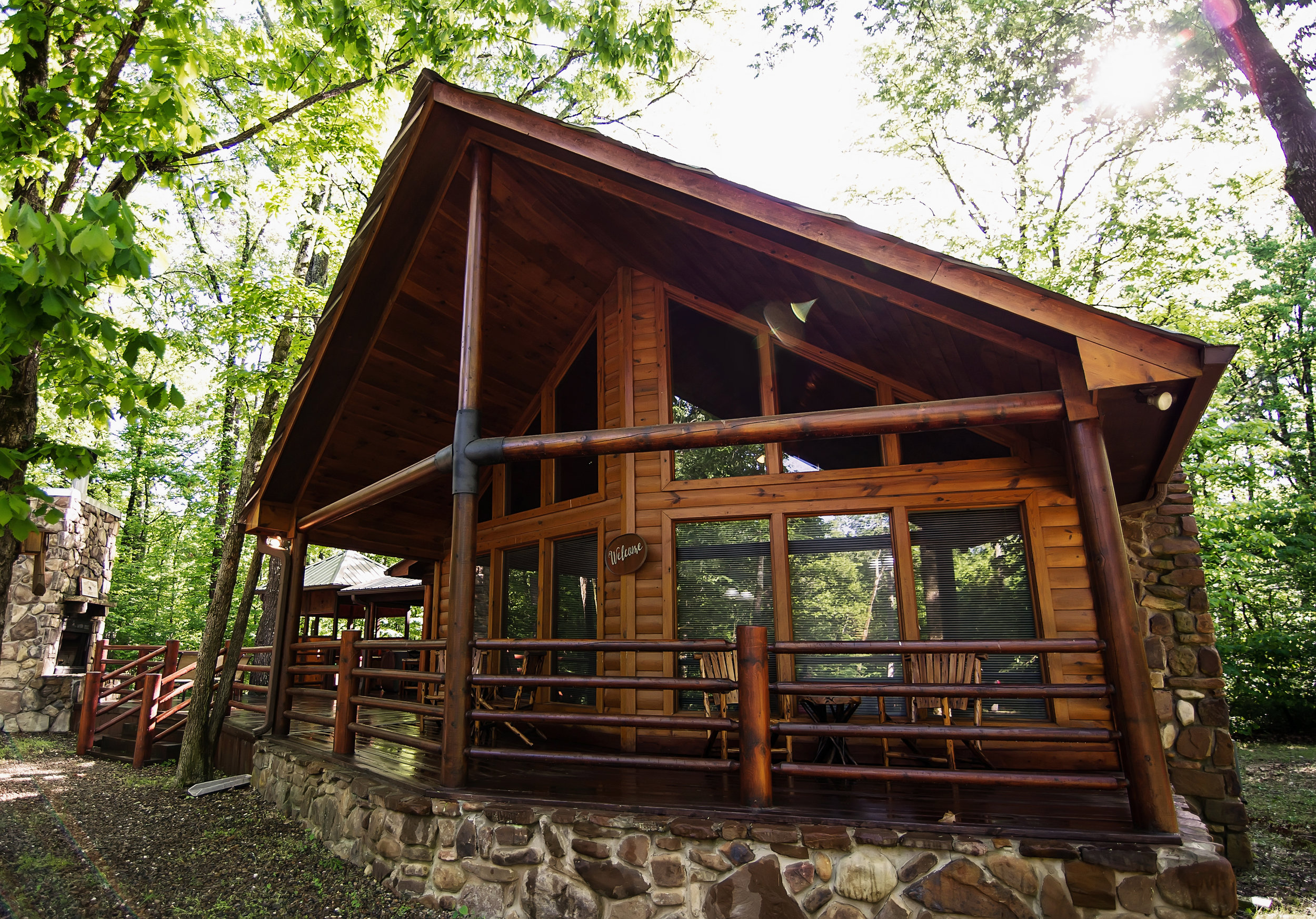 Round up the gang and head out to Front Porch Lodge for a summer vacation you will love to remember! This beautiful cabin sits along a quiet lane and is hidden from other cabins by the surrounding forest. A true family cabin – Front Porch Lodge has spaces ready to be filled. This 3 bedroom cabin will sleep 10 guests in comfort. The upstairs master suite has a king size bed and a private balcony. The upstairs landing has a sitting area with a daybed w/ trundle. Downstairs there is a queen bed and a daybed w/ trundle in the guest room. And the luxurious master has a 4 poster king bed, a jetted tub and large shower in the bathroom, and separate entrances to both the front porch and a private back deck. Find time to lounge around the large great room with soaring vaulted ceilings and floor to ceiling windows. Watch movies in front of the stone fireplace until it is time to eat. A farmhouse dining table invites everyone to have a seat and sit a while, sharing meals prepared in the ready to cook kitchen. After the dishes are cleared, move the fun outside. The huge front porch offers several options to relax – try them all. Start a fire in the outside fire place and prop your feet up on the stone hearth, or sink into the warmth of the covered hot tub. Grab a glass of wine and pick a seat and let the stories begin. The large lot also offers plenty of room for kids to run and play and a more standard fire pit for roasting hot dogs and marshmallows.