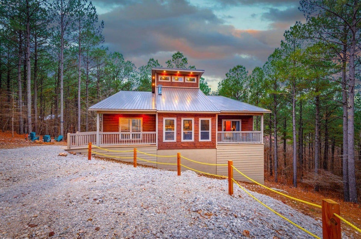 GLORIOUS SUNSET formerly known as LAZY SUNSET is a cozy cabin located in the upscale Timberceek Trails South. It has two large covered decks on the lower and upper level. Bring the family outside onto the decks and enjoy the beautiful views of the forest. You can catch a glimpse of the astounding ridge through the tall trees. Curl up to the outdoor fireplace or walk down to the lowest level and roast some smores in the outside fire pit. There is plenty of room for everyone! This family friendly vacation cabin accommodates sleeping arrangements for up to 8 guests. It has 2 king bedrooms downstairs and a closed loft upstairs. One Master suite downstairs has an en-suite bath with a serene beautifully tiled 2-person walk in shower and a luxurious soaker tub with a view to the outdoors. All modern finishes are designed for relaxing and pampering. The other King bedroom has a beautifully tiled walk in shower and modern finishes with a rain fall shower head for that lavish spa-like feel. Walk upstairs to the separate loft equipped with two built in bunk beds. All the kids have their own area to sleep and hang out in while the adults gather around the fireplace downstairs. There’s also a bonus room upstairs where everyone can gather and enjoy a round of Foosball and several board Games. This cabin will be a perfect spot for your group to make some lasting memories. Whether indoors cooking your favorite meal, or outside roasting marshmallows and soaking in the hot tub, GLORIOUS SUNSET is sure to be a wonderful cabin for your vacation!