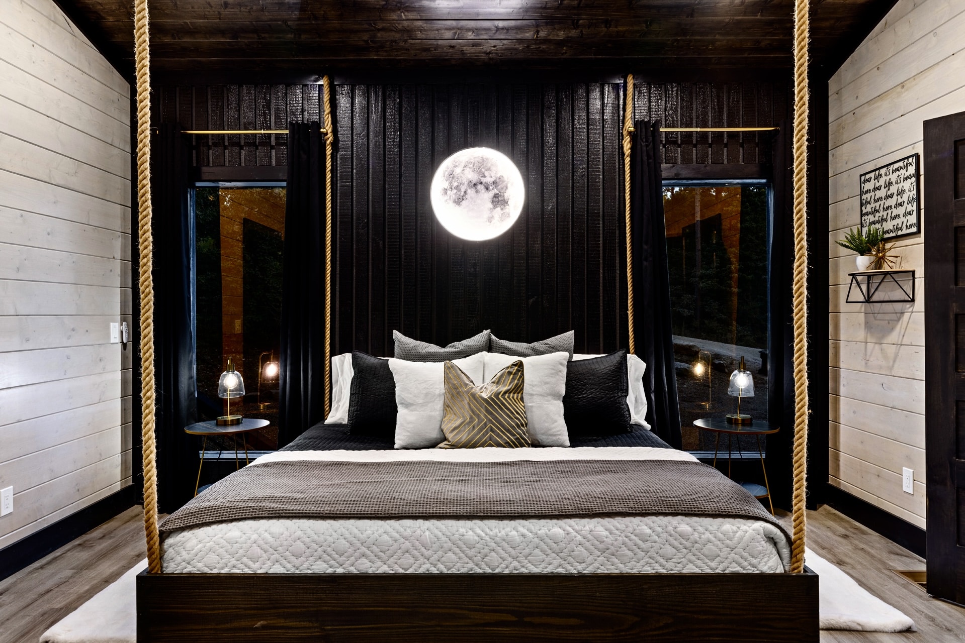 Indulge in a magical escape to Gypsy Moon Cabin! Gypsy Sisters Travel is bringing you an enchanting modern 1-bedroom couples cabin featuring a “floating” king bed with high end amenities. This mystical location is ideal for couples seeking a romantic getaway or retreat. Gypsy Moon is tucked away amidst towering, tall pines for a sense of privacy in a secluded development, yet only minutes from Beavers Bend State Park and activities in Hochatown. Gypsy Moon Cabin was added to The Gypsy Cabins, Broken Bow Luxury Vacations Collection in August 2023 with 1,250sf of indoor living area and spacious outdoor deck. Â