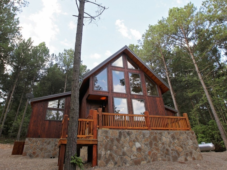 Hilltop Hideaway is a two bedroom cabin with two master suites, two master bath cabin with high-end finishes. The spacious interior features hand-crafted timber frame trusses and floor to ceiling windows. Each master suite is outfitted with king-sized beds, DownLite bedding, tiled showers, Jacuzzi tubs and French doors leading to la large, private covered patio. Hilltop Hideaway is built to Green Cabin standards.