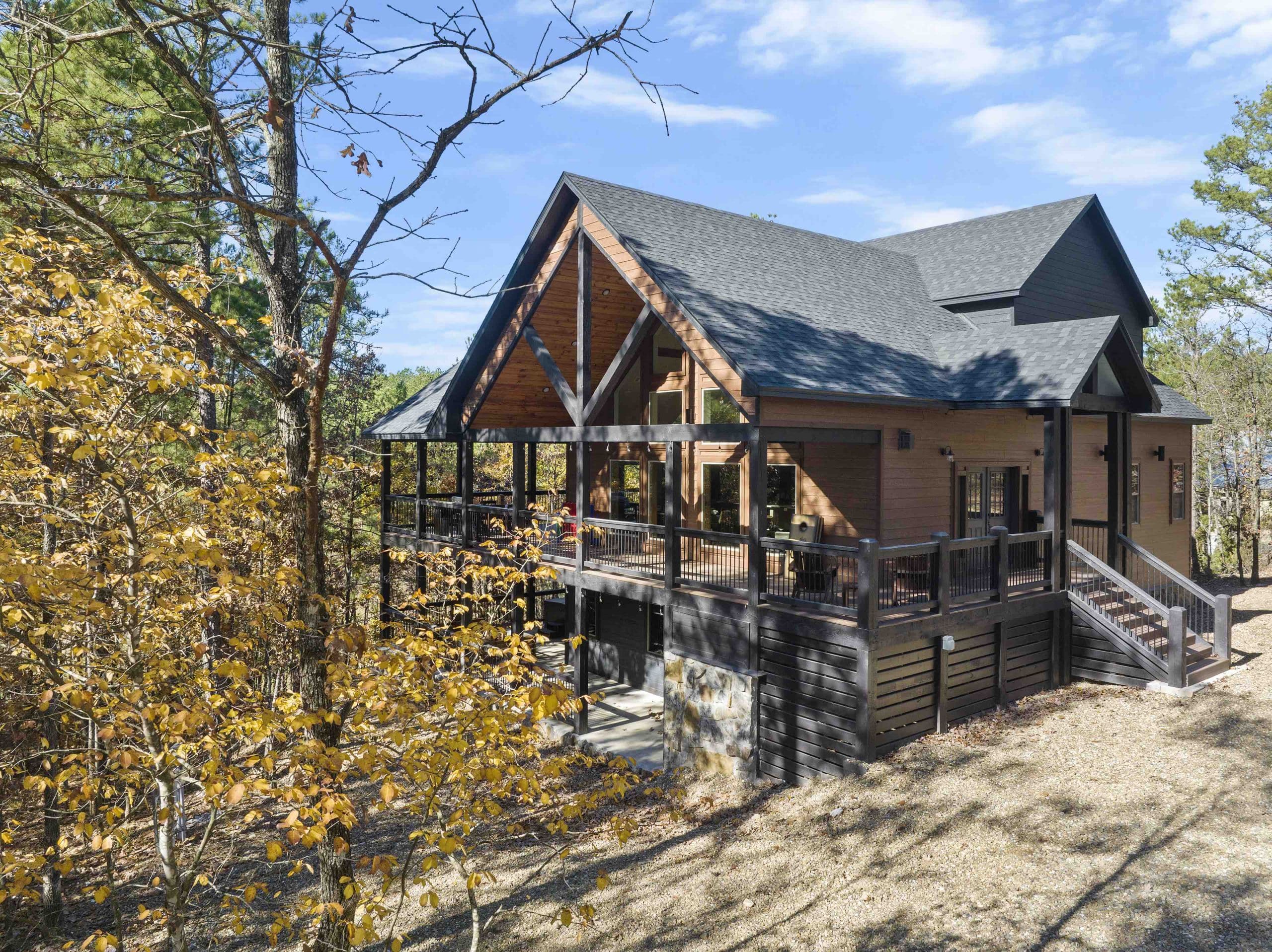 Featuring 3 king master suites, a bunk room that sleeps 6, and expansive living spaces, Howling Wolf Lodge comfortably accommodates up to 14 people. Enjoy the outdoor wraparound patio overlooking Pine Lake, complete with a Jacuzzi tub, cozy seating, and life-size chess and poker tables. Swing your heart out on the lower deck, surrounded by nothing but trees, or admire the beautiful scenery from the balcony off the third-floor master suite.
