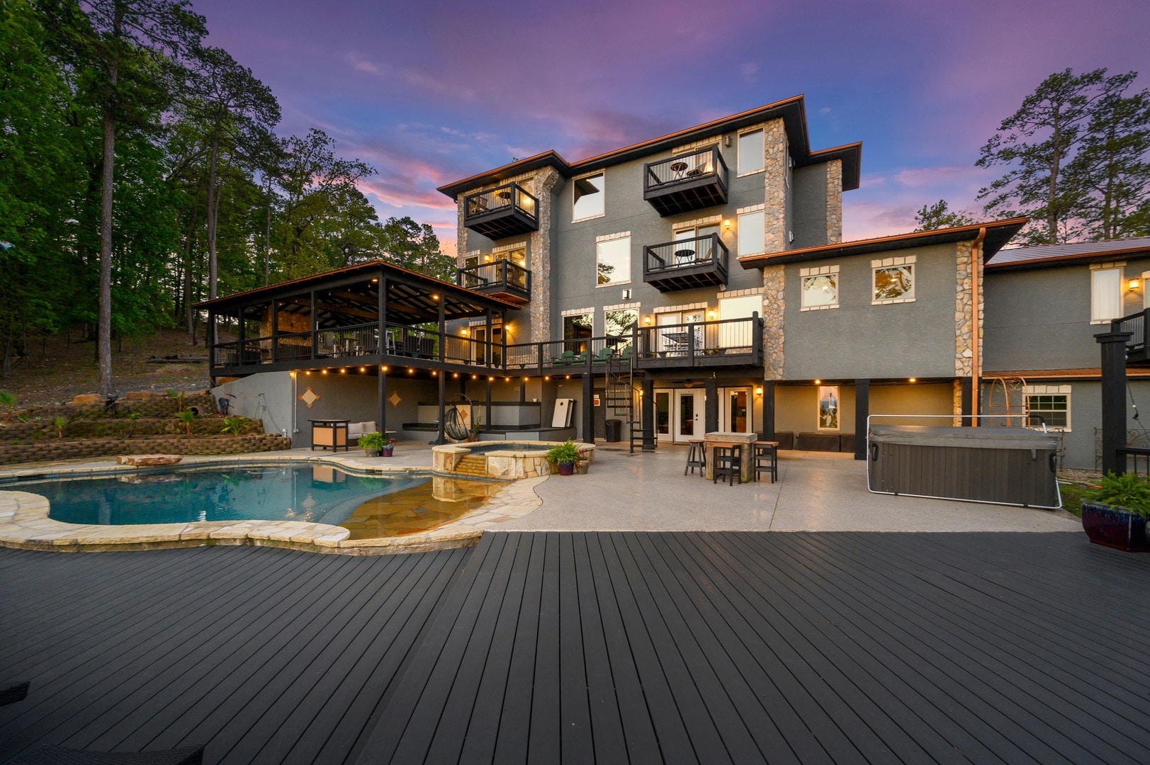 Lago Vista is a rare find in Beavers Bend with a spectacular view of Broken Bow Lake, pool and half mile walk to the lake! The property sits on 3 private acres surround by Foresty land. It offers more seclusion than most cabins in the city limits and is not subject to the 7 percent tax increase. Lago Vista has 7 king bedroom, a bunk room with 2 sets of queen bunks and a second bunk room with 3 sets of Twin bunks, as well as two additional sets of twin bunk for a combined sleeping arrangements of 34 guests in beds.