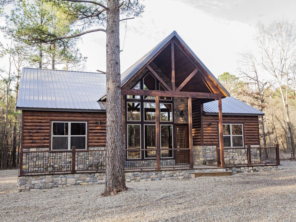This one level cabin nestled in the piney woods is the perfect getaway for family and friends to reconnect. It has 4 bedrooms with King size beds, each with its own bath. 1 is a master suite with shower and jacuzzi tub the other 3 all have shower/tub combos in the bath. There are 2 rooms located on each side of the Kitchen and living room so that everyone has their own space but also feel part of the group. The outdoor space has a large wood burning fireplace on the deck with a table and chairs for outdoor dining. There is also a great fire pit area to enjoy the evening air, smores and, of course, the stars.