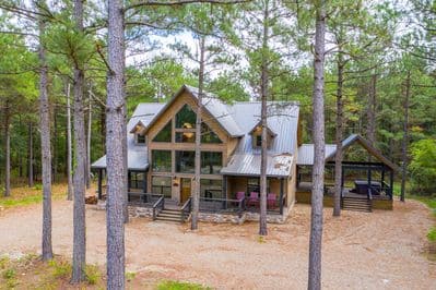The 1680 square feet of outdoor porch provides plenty of beautiful covered space! This porch is complete with a hot tub, grill, table for 10 and fireplace with seating area to enjoy the 80 foot tall pines that are surrounding the 1.69 acres of the cabin. We have ladder ball and corn hole on site & still adding more outdoor recreation. At night relax and escape to the fire pit out under the Oklahoma stars and catch a glimpse of the big dipper!