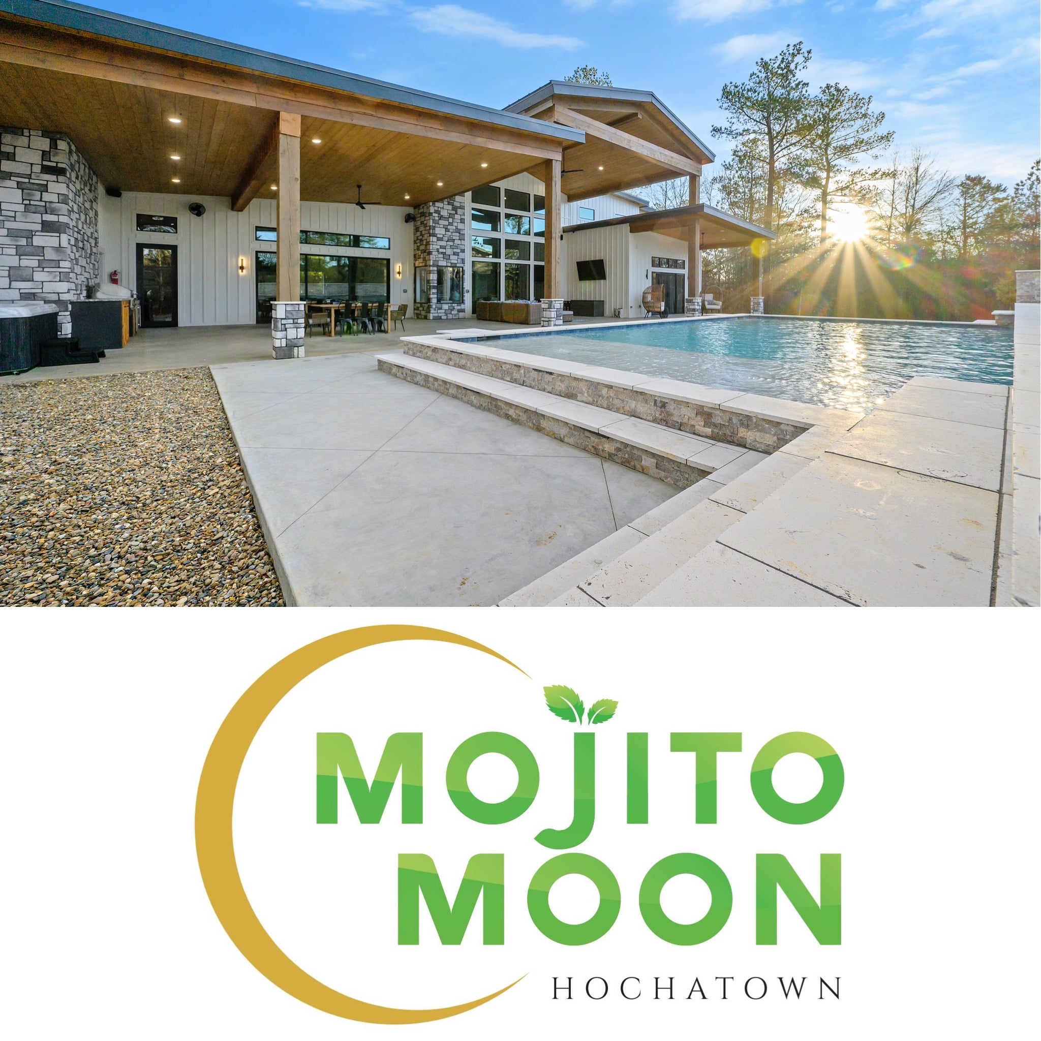IN-GROUND, ALL-SEASON POOL (36′ x 18′) 4 King Suites, 1 Double Queen Room, 1 Bunkroom, Sleeps up to 24 total. Mojito Moon features a primary master retreat with an oversized master bedroom complete with dual head showers, soaker tub, fireplace, and private sliding doors to the patio. This resort-style retreat features an unforgettable year-round private pool sure to please without even leaving the cabin. The back patio spans more than 1,800 sq ft with ample space for gathering, games, or just relaxing to the calming sounds and view of the pool. This in-ground, heated pool offers an opportunity to swim year round, if you so desire (optional heating fee may apply). The hot tub for 8 is under the covered patio for starry night relaxation or even a rainy day dip. The cabin’s lush landscape surrounds span of covered outdoor space that is a perfect compliment for relaxing poolside. A fully equipped, oversized kitchen with a large sliding door that opens to back patio offers ample room for both cooking and gathering. Mojito Moon has a multitude of gathering spaces for your group with indoor and outdoor living and dining areas as well as our Lounge Room. Our flat circle drive provides plenty of space for your everyone to park and even bring a boat through. Located in the heart of Hochatown, just minutes away from all your favorite restaurants and attractions. Come experience Broken Bow/Beavers Bend area the Mojito Moon way!