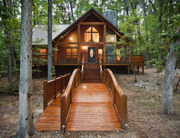 Morning Star Cabin, is tucked into a stand of large hardwoods and accessed by an arched bridge over a small wet weather branch. It is complimented by yellow pine paneling, blue-stained pine ceilings, beautiful circle-sawn oak floors, and rock fireplace with auto-light gas logs. The living areas are spacious and the bedrooms are large. A popular attraction is the covered back decks with large privacy hot tub and sitting area. The bedroom furniture and tables are handmade and beautifully crafted from native Eastern Cedar logs. The kitchen has all the cookware, utensils, dinnerware, and appliances of a typical home in addition to an outside propane grill. A large HDTV is in the living area and a smaller HDTV is in the master bedroom.