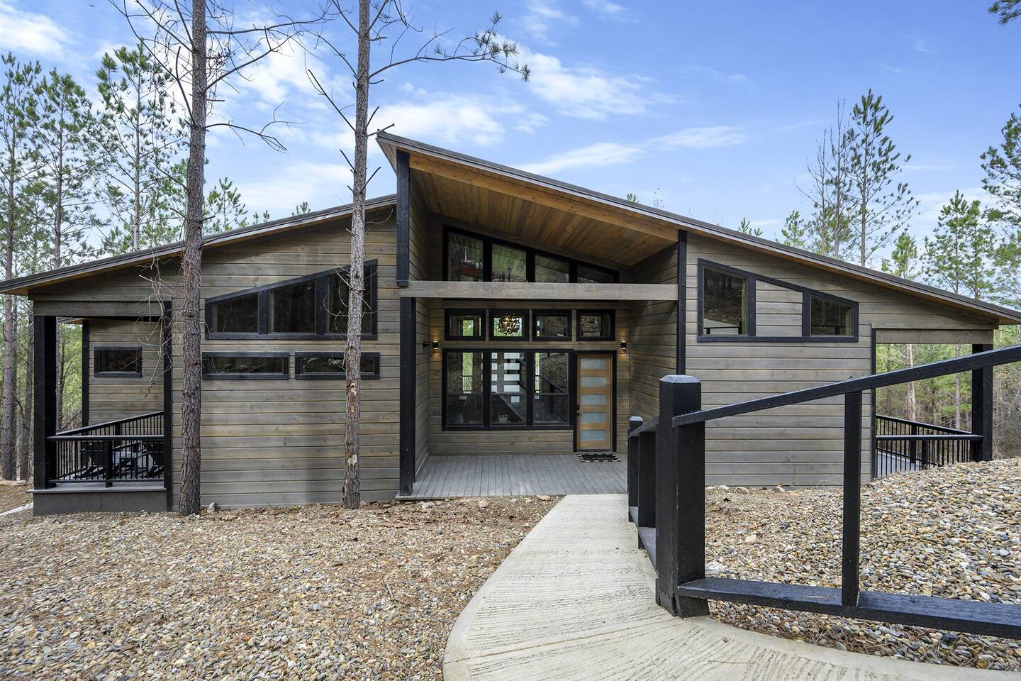 Additionally, there is a paved driveway at the top of the cabin, equipped with a paved walking ramp and sturdy handrails to guide you safely to the front door entrance.