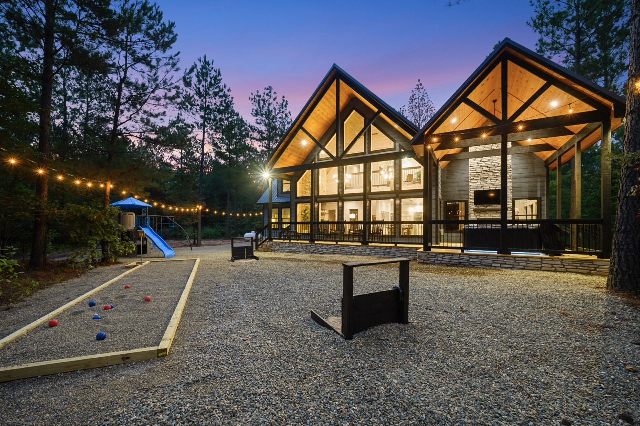 As you walk in the door you are greeted with a culinary kitchen and walls of windows. The open floor plan makes it easy for the whole family to be together while eating, playing games, or relaxing in front of the stone fireplace. The kitchen features quartz counter-tops and stainless-steel appliances (including a wine fridge). There are 2 king suites, with individual bathrooms featuring spacious vanities, a soaking tub, and walk-in showers. Each bedroom also features 55-inch smart TVs. Upstairs you will find a loft that many can enjoy a board game, puzzle and/or poker. The downstairs bunk room offers an ample opportunity for fun and competition with a game console and foosball. Outdoor games provided include: corn-hole, horseshoes, yard Yahtzee & our family favorite, a Bocce-ball court.