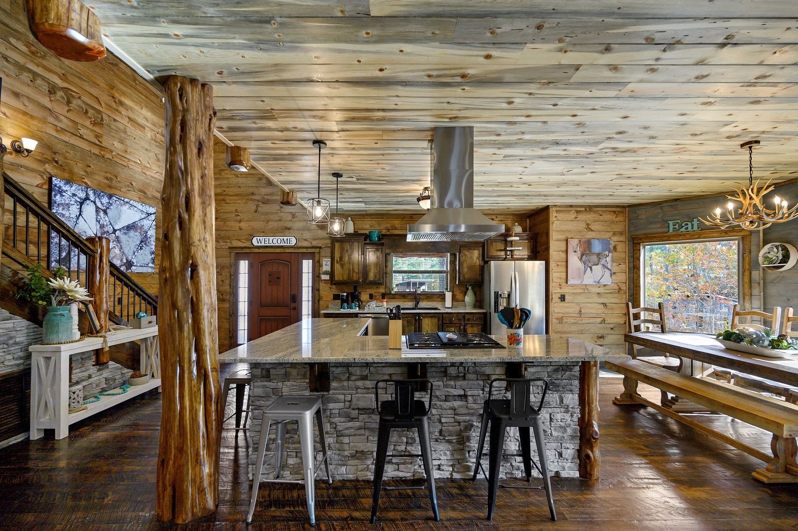 As you enter this marvelous cabin you enter the large open floor plan. First the spacious kitchen with any appliance you will need for preparing any meal or snack for your stay. Large counter spaces, beautiful barn sink and stainless steel appliances.