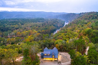 Your beautiful journey to Rio Vista begins the moment you turn off of Highway 259A into the Cordillera subdivision. From the winding road up the mountain to the stunning views of beautiful Broken Bow Lake, Rio Vista has no equal in Hochatown. A 3-acre plot on the mountaintop allows you to experience both the breathtaking view as well as the gentle sounds of the Mountain Fork River flowing below. Walk through the cabin and discover different spectacular views of majestic mountains, beautiful bluffs and a rippling river. However, Rio Vista’s beauty is not only outdoors as the cabin and décor were inspired by Ralph Lauren’s Double RL Ranch (located in the mountains of Colorado). The living room and kitchen are an open concept with the focal point being an incredible, real rock fireplace to keep you warm on those chilly days. This modern beauty is complete with stainless steel appliances and granite counter tops in the kitchen. Pass the time while cooking by watching your favorite show on the TV conveniently located in the cabinets. With 10 seats at the table and 4 bar stools, you may comfortably seat the whole family for your holiday meals. Open the barn doors in the living room to access the game room. Play pool/board games or watch your favorite holiday movie on the TV with your family in the game room. When you are ready to call it a night, direct the family upstairs to their bedrooms. The upstairs, king bedrooms give you an old west feeling from the wood plank floors and dark ceilings/trim to the metal bed frames with antique nightstands This cabin has it all with two bedrooms and bathrooms on each end of the cabin accompanied by an open loft upstairs with a beanbag sitting area and a couch that makes into a bed. Make your way to the king master bedroom and bath downstairs for your peaceful night of sleep. In the morning, refresh yourself inside and out in the copper pedestal tub or the glass top, travertine shower as you take in the mountain view. His and her sinks, granite counter tops, and a walk-in closet all compliment this luxurious bathroom. The same sound system connected to the living room, kitchen, and game room also plays at outdoor hot tub. So get outdoors with those tunes on to savor the mountain air and beauty while lounging in the hot tub or sitting around the outdoor fire pit or at one of the various outdoor lounging areas! To keep your loved ones safe on the porch (on the view side), a rail with a gate as well as a rock barrier by the fire pit are in place. Â