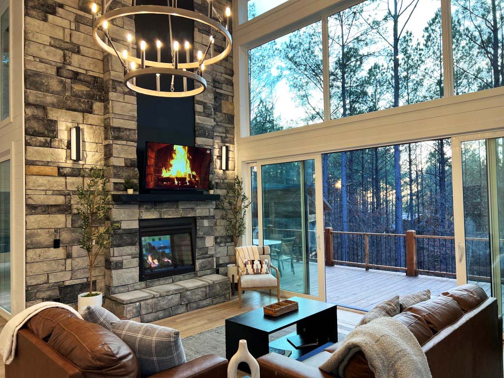 Rustic Haven offers a harmonious blend of natural wood and modern lines showcasing the floor-to-ceiling sliding glass doors which provide a stunning frame to the breathtaking surroundings, allowing the beauty of the outdoors to flow effortlessly into the cabin. Stepping outside, you are greeted by a panoramic vista of the surrounding wilderness. The bedding is a lavish sanctuary where soft, high-thread-count linens embrace you in a cocoon of comfort. Nestled within the serene, towering pines of Broken Bow, Oklahoma, you’ll find a light and bright, rustic-modern cabin that epitomizes the essence of luxury and relaxation, Rustic Haven. This stunning 2 bedroom retreat accommodates up to 6 guests and is a true testament to the merging of nature’s beauty and contemporary design. Rustic Haven is an approximately 2,100 square foot luxury cabin offering a cozy and fresh escape for those seeking the perfect getaway. Upon entering the cabin, you’re welcomed by an abundance of natural light and comfort. The interior is light and airy, with an open concept design that seamlessly connects the living, dining, and kitchen areas. Floor-to-ceiling sliding glass doors provide a stunning frame to the breathtaking surroundings, allowing the beauty of the outdoors to flow effortlessly into the cabin. The fully equipped open kitchen features quartz countertops, oversized gas cooktop and large peninsula with bar stools seating for four. The kitchen is stocked with cooking tools and dining items. The living area has a sofa queen sleeper, a 55” HDTV with YouTubeTV streaming (w/ Local Channels), and soundbar. The attention to detail is evident in every corner of the cabin, particularly in the luxuriously appointed king bedrooms. The bedding is a lavish sanctuary where soft, high-thread-count linens embrace you in a cocoon of comfort. Plush pillows and sumptuous duvets beckon you to unwind and indulge in restful slumber. The cabin’s 2 ensuite king bedrooms offer pure relaxation and a place to rejuvenate. It’s a retreat that defines luxury in the most exquisite way, as each bedroom has an attached spa-style bathroom offering tiled walk-in rain showers and corner Jacuzzi tubs. One of the bedroom suites has double sliding glass doors that open to the deck area. Both bedrooms have 55” HDTVs with YouTubeTV streaming (w/ Local Channels). Perhaps one of the most enchanting features of this modern cabin is the back deck space. Stepping outside, you are greeted by a panoramic vista of the surrounding hardwoods and pines. The expansive 1,000+ square foot deck offers a front-row seat to Oklahoma’s mesmerizing sunsets. Imagine sipping a glass of fine wine as you watch the sky transition through hues of orange, pink, and purple, casting a warm and enchanting glow over the landscape. The deck area also includes a gas burning fireplace, 6-person hot tub, 55” HDTV with YouTubeTV steaming package, gas grill with propane provided, and plenty of seating. A fire pit for wood burning fires is on the ground level. Relax in your private hot tub or enjoy a swing on the hanging rope chairs near the outdoor fire pit. String lights lining the outdoor space allow for enjoying nature’s beautiful surroundings well beyond sunset. Rustic Haven is a sanctuary for those who appreciate the finer things in life. With its modern design, plush bedding, well-appointed kitchen, attention to detail, and mesmerizing sunset views from the back deck, it promises an unforgettable escape into the heart of nature, where comfort and beauty harmoniously coexist. Rustic Haven is located in Timber Creek Trails South, only a few minutes away from local restaurants and bars, breweries, distillery, wineries, Broken Bow Lake, Beavers Bend State Park and other attractions. Rustic Haven’s abundant list of luxury amenities will not disappoint. We also have our 2 bedroom sister cabin, Rustic Treehouse is the next cabin over if you are looking for another cabin within walking distance.
