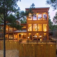 Rustic Heights cabin is a spacious 2-bedroom cabin that accommodates up to 6 guests. This stunning custom luxury cabin is over 2,150 square feet with over 1,000 square feet of deck space for entertaining and relaxing. With 33 feet of towering floor to ceiling windows, large sliding glass doors, and picture windows throughout, you are enveloped in nature with beautiful pines and hardwoods around the cabin. The cabin boasts 2 wood burning fireplaces on the front and back decks as well as a fireplace in each bedroom and one in the living room.