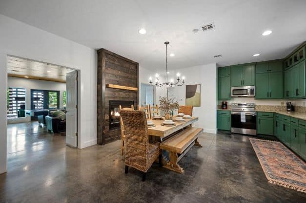 Kitchen and Dining: Beautiful double-sided fireplace, large farmhouse table with seating