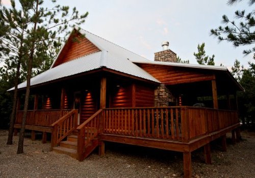 Shear Pleasure is a one bedroom rental cabin built for couples who appreciate luxury. The premium features start outside with a large wrap around covered deck with a real wood fireplace located by a 4-5 person hot tub. The cabin is surrounded by native pine creating a sense of privacy that you can enjoy from the covered deck and on deck real wood fireplace.