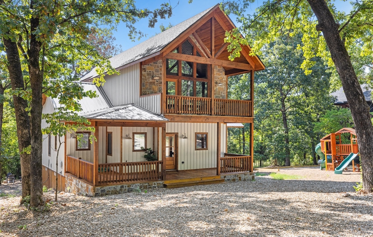 Looking for a little Southern Hospitality in Southeastern Oklahoma? Southern Honey is a newly built 1789 sq. ft. 2 bedroom, 3.5 bath cabin with a loft for extra sleeping. As you enter the cabin, you will be greeted by a well appointed kitchen complete with a coffee bar and Keurig coffee maker. Have a seat at the bar and enjoy a sweet tea while watching the chef in your group prepare a meal. There is also plenty of seating for everyone around the large dining room table. Just off of the kitchen is a laundry room with a half bath. The open concept allows you to visit with the rest of your party in the living room while enjoying all the features in the state of the art kitchen. Gather around the large TV to watch your favorite program or sit and read in front of the indoor gas fireplace. One of the King Master suites is to the left of the living room with a large walk in shower and the other King Master Suite is to the right of the living room, also hosting a large walk in shower and double sinks. Each bedroom has access to the back deck. Head upstairs to the loft for extra sleeping with a set of triple bunk beds featuring 2 twins over a full and a daybed with a trundle, sleeping an additional 5 guests. There is an attached full bath upstairs and access to the deck on the front of the cabin. Outside, there is a propane grill, gas fireplace, extra seating, a giant Jenga set, and a nice bubbly hot tub for relaxing and unwinding after a long day exploring. Off of the back deck, you can head down the stairs to the pond or sit by the fire pit and roast some marshmallows. Southern Honey would not be complete without a playground for the kiddos! Come to Hochatown and quench your sweet tooth at Southern Honey!!