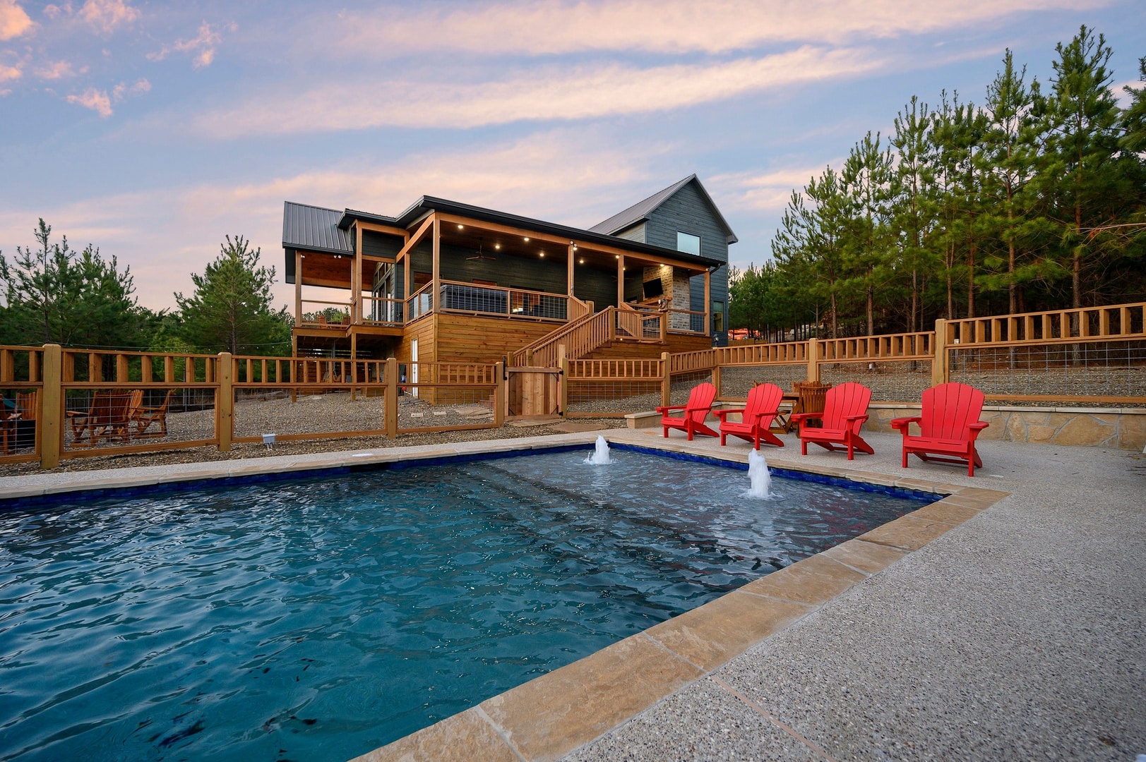 Not many properties in the Hochatown area are able to offer a private pool. The pool is fenced in as will as surround by tall pines. The crystal clear crisp clean pool is the perfect place to relax catch some rays and let the children and all the guests take a refreshing dip and enjoy the playful in pool fountains! (Pool is seasonal and NOT heated)