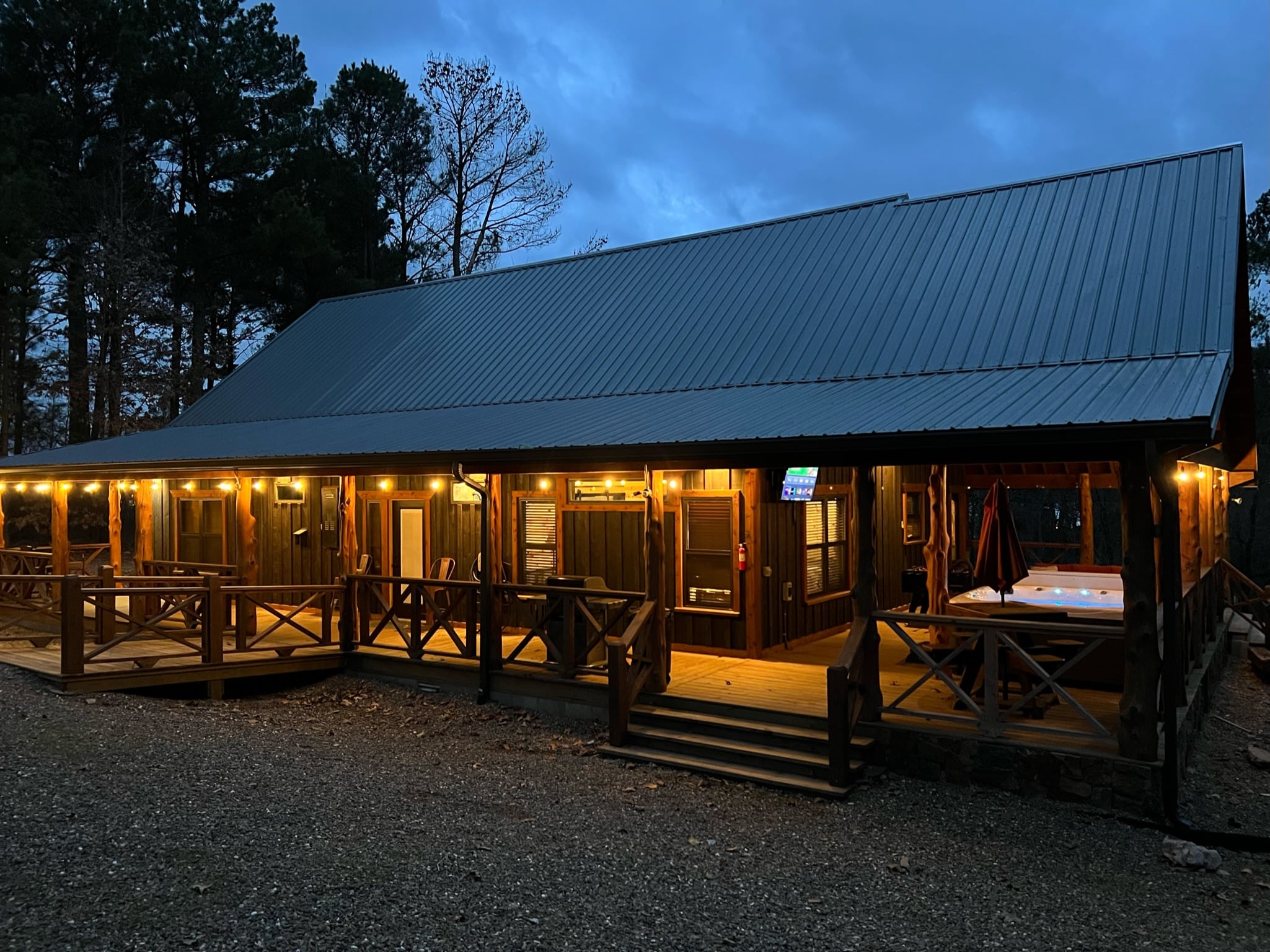 Planning your getaway to Broken Bow? We would love to host you at Spotlight Delight! Attention to detail is evident from the moment you pull into the driveway. Authentic timber logs line the wrap around deck which includes vaulted ceilings with large outdoor ceiling fan, hot tub, firepit, tv, and foosball table making it the perfect place to relax! We love getting cozy on the outdoor loveseat with a cup of coffee in the mornings or unwinding with a glass of wine in the evenings around the fire. We’ve recently added a double glider as well because who doesn’t love a good glider? It gives us Grandma’s back porch swing vibes – which we love! Inside, you will find the same attention to detail and authentic cabin touches. When you are staying at the cabin, we want you to be surrounded by quintessential cabin elements: wood, stone, fire, and all of the homey touches that transform your stay into a retreat. The floorplan is open-concept which makes it perfect for entertaining and hosting. We’ve recently added two new entertaining amenities including a Shuffleboard Table and an Infinity Game table (think giant iPad!). A centrally-located wine bar includes a wine refrigerator and all of the tools you need to mix up an after (or before!) dinner cocktail! There are two pub-style dining tables in the main area of the cabin near the wine bar that seat up to ten guests. The kitchen is fully stocked, including a coffee bar area equipped with a Keurig/Carafe combo coffee maker and a Nespresso machine (if you’re feeling a bit bougie). Coffee, cream, and sugar provided! There are plenty of pots and pans, serveware, cutlery, and knives. A blender, crockpot, and toaster are also provided. (Please feel free to inquire about any specific information regarding kitchenware and we will be happy to provide that information to you.) The living room is furnished with a large, oversized pull-out sofa and loveseat. The sofa bed is equivalent to a queen size bed – additional bedding can be found in the lower cabinets of the wine bar. There is also a recliner in the living room, perfect for game days! In the living room you will notice the propane fireplace which is surrounded by authentic Oklahoma bluestone adding lots of charm to the living area. There is a remote attached to the wall which is used to turn the fireplace on and off. We love the cozy ambiance the blue glow adds to movie nights! This fireplace will give off a lot of heat in the winter months, as well. One of our favorite things about this cabin is that there are TWO En Suites! No more fighting over who gets the best bedroom because they are both amazing and exactly the same. Each room has its own En Suite including large walk in showers with rustic wood tile, double vanities, and toilet. We provide toiletries, towels, and toilet paper in every bathroom. There are hair dryers in each En Suite as well. Both bedrooms are furnished with King size beds, televisions, and nightstands with lamps and chargers. Two additional hide-away cots can be found under the bed in the “Red” bedroom. In the hallway leading to the back deck, you will find a powder room and laundry room. We have a washer and dryer on site with detergent provided. There is a broom and vacuum as well should you need it during your stay. We are proud to be a pet friendly cabin! Please bring your furry family with you to Broken Bow! It is a terrific place for your pet as there are plenty of hiking trails and fun outdoor activities for the whole family very nearby. We even provide dog treats, so be sure to dip into the “cookie” jar when you arrive! If you decide to get out and about and walk the neighborhood, be sure to head toward Yard Under the Pines. It is a short walk from the cabin and a fun place to check out. We encourage you to pop into one of our favorite stops, Sasquatch’s Candy Den! It is a fun place for kids and adults with their wide assortment of candies from build your own bag to hard to find vintage treats! We are also (im)patiently awaiting the grand opening of Naaman’s BBQ which is scheduled to open sometime this spring! Hochatown Mountain Co. is also a fun stop if you are looking for souvenirs and/or local keepsakes, candles, etc. We would love to have the opportunity to host you and your guests during your next visit to Broken Bow! -Chad and Britney