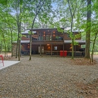 Steel Creek Lodge North is the perfect getaway for friends or large families. This newly constructed 4000 sq. ft luxury cabin offers 7 king bedrooms all with flat screen smart tvs, 3 of them being on the first floor, 1 master suite with private bathroom and the other 2 king bedrooms share a bathroom in the hallway. The other 4 are located upstairs, 2 king bedrooms to the left share a bathroom between them as well as the 2 king bedrooms to the right, they are adjacent to the game room that boasts both a pool table and shuffle board. There is one luxury queen sized sleeper sofa that serves the dual purpose of lounging or extra bed. You can step out onto the massive balcony and enjoy your beautiful wooded backdrop or gaze at the star filled skies also enjoy playing the life size chess set.