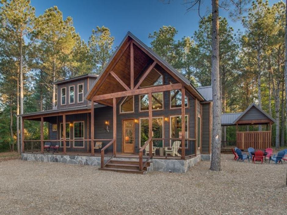 A welcoming front porch awaits your arrival to the Stone Pine Hideaway cabin. The cabin has an open living room and kitchen that is large enough to have everyone join in the daily activities. With floor to ceiling windows the natural beauty floods into the relaxing atmosphere.
