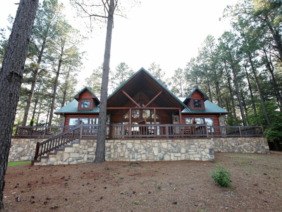 Talewater Cabin is a luxury three bedroom cabin situated on the top of a mountain in Timber Creek Trails with a stunning view of the surrounding forest. A 2,200 square foot deck surrounds the entire cabin. Enjoy coffee (or hot chocolate) and a serene morning in a private setting. You can enjoy a morning sunrise on the two level front deck. The upper deck is covered so you can enjoy the view regardless of the weather. The cabin is situated on 1.5 acres, with a private backyard that is level and perfect for family games. The cabin also has a fire ring in the backyard. The back deck features a covered area with a large rustic pine picnic table to enjoy family dinners outside. The back deck also has a large wood burning fireplace and an open sky hot tub to enjoy watching the stars in the privacy of the backyard.