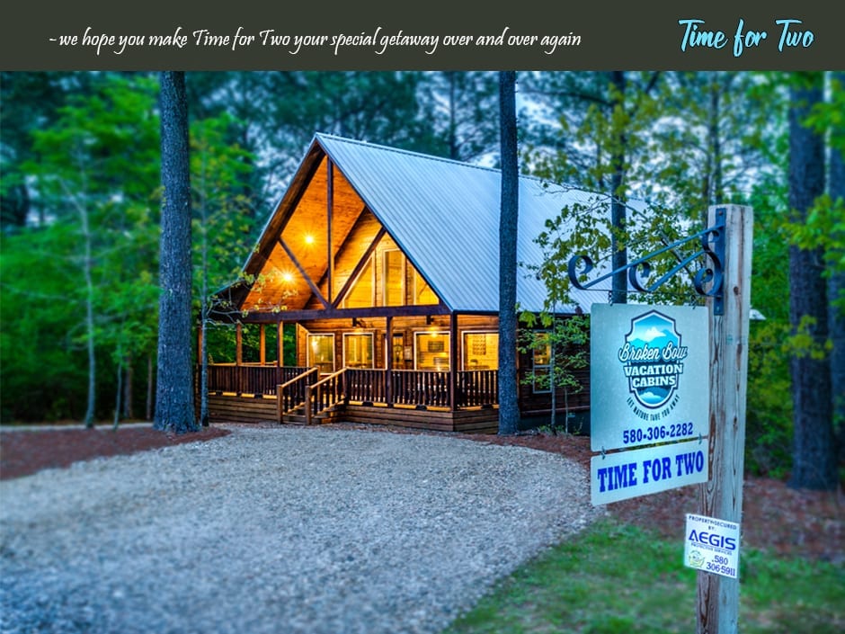 Time for Two is a one-bedroom cabin that offers a cozy inviting atmosphere in the heart of the Southeastern Oklahoma woods only minutes from Broken Bow Lake and Beavers Bend State Park in Oklahoma.