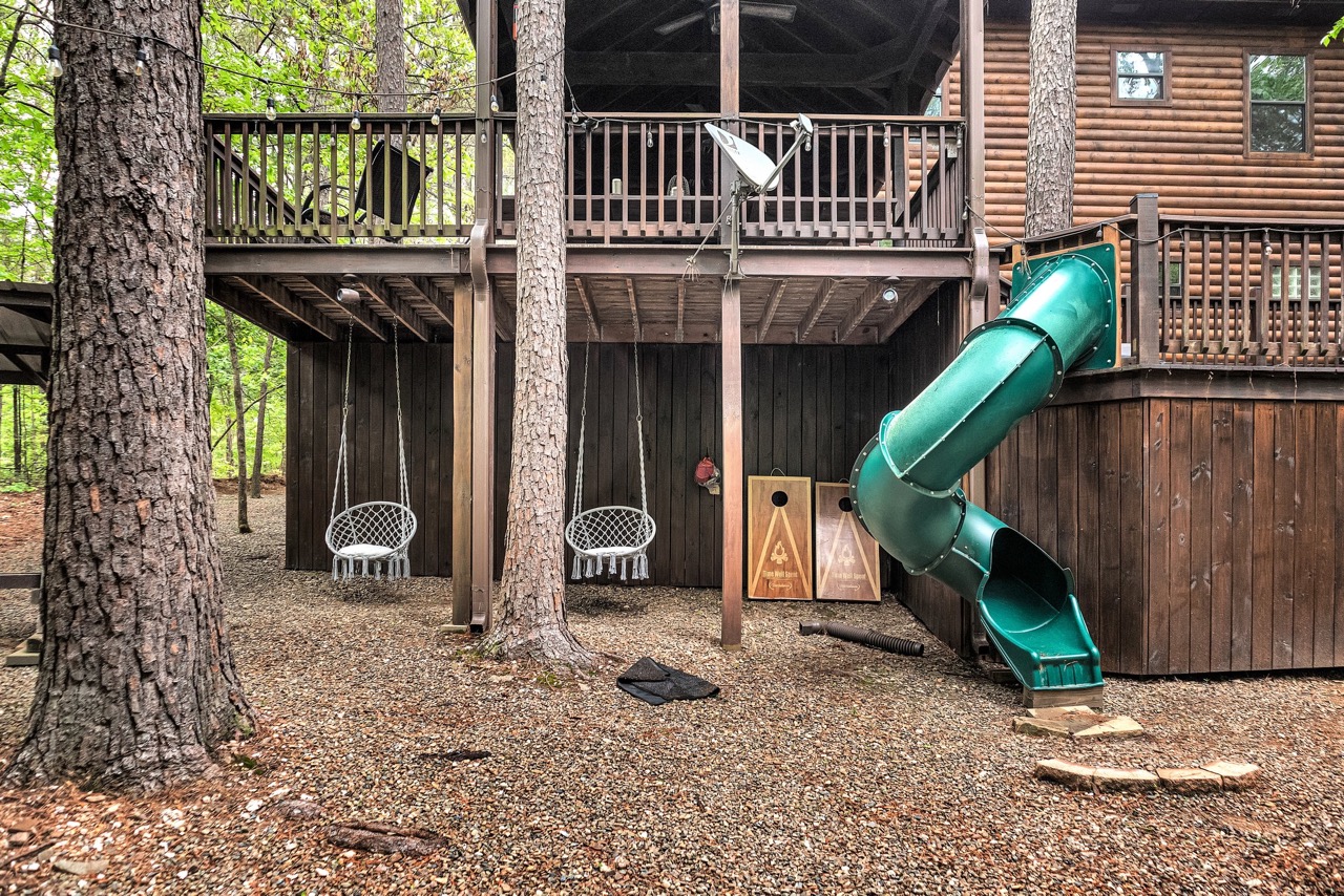 Relax outside in the covered dining area with an outdoor television, soak up the sun on the open deck, and relax in the large hot tub cabana while the cook in your family grills up a great meal on the Weber gas grill. Kids will surely enjoy the Lifetime play set outside and will have fun on the deck slide. Team up for a game of horseshoes with your friends and make memories roasting marshmallows in the large fire pit.