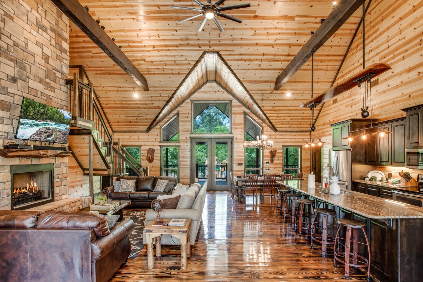 Written in the Stars Luxury Cabin was designed and built with high luxury in mind. Perched over 30′ up in the tree tops boasting a wrap around deck with outdoor living room w/ SmartCableTV, hot tub, grill, and fireplace. Inside the cabin has solid hardwood pecan flooring, designer kitchen with aged copper vent-a-hood, island w/ leathered granite, deep sink & commercial grade faucet, high end appliances and fully stocked for your stay. The living room has a leather queen sleeper sofa and plush leather chair, Large flat screen SMART TV, Gas fireplace, and windows all across the back wall for amazing tree-top and mountain views. The luxury custom build solid wood KING bed sits in the middle of the cabin w/ incredible views from every angle. Saving the best for last the 15’ wide walk in shower has 3 shower heads including a rainfall head in the middle. Next to to it sits a clawfoot Soaker Tub which also has views of the mountains/forest from every angle. Custom designed double vanity across the back wall and stackable washer/dryer in laundry closet. This cabin was perfectly designed for a couple in mind, but the queen sleeper with luxury linens provided gives you the option to bring the kids along if you like. Come out and see the stars!