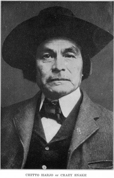Chitto Harjo, Creek Patriot, Died on April 11. 1911. Age 65. Called “Crazy Snake,” he led against allotment of Creek lands. Fearing “Snake Uprising”, U. S. deputies went to arrest Harjo who eluded them. He came away wounded, and died here in the home of a Choctaw, Daniel Bob. Grave is about 5 1/2 miles southwest of Smithville