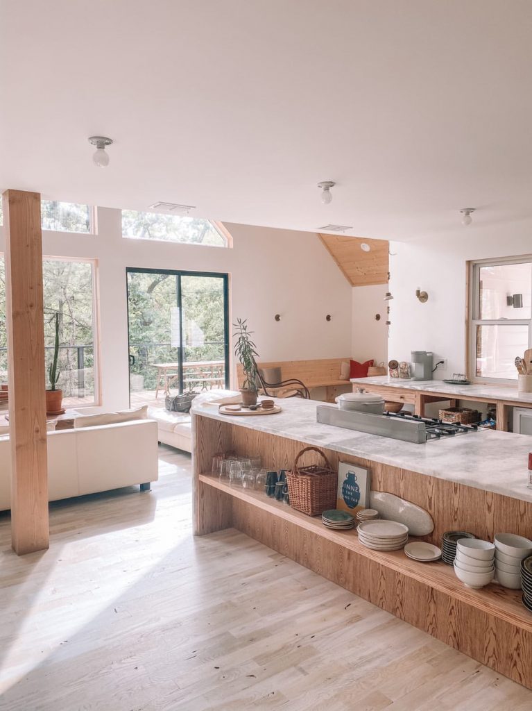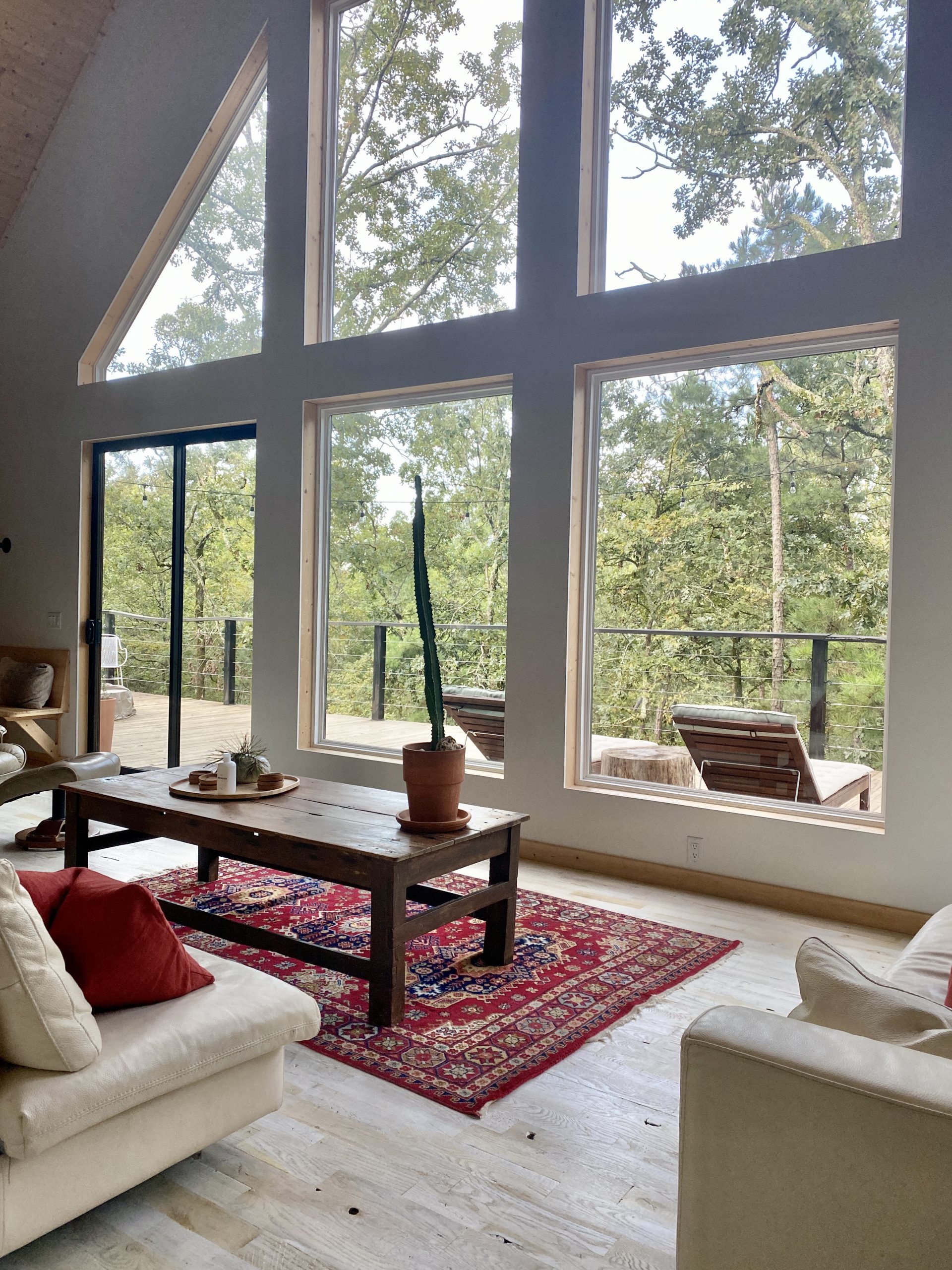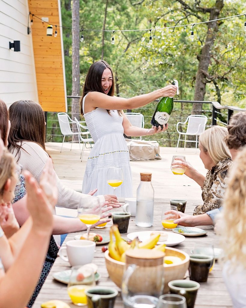 Inside, we popped some bubbly and admired the floor-to-ceiling windows, pine woodwork, modern boho decor and a deck big enough for the entire Bride Tribe.Â
