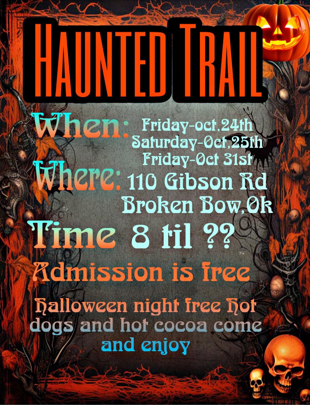 Haunted Trail October 31, 2025 @ 8:00 pm - 10:00 pm Haunted Trail 110 Gibson Rd 110 Gibson Rd, Broken Bow, Oklahoma