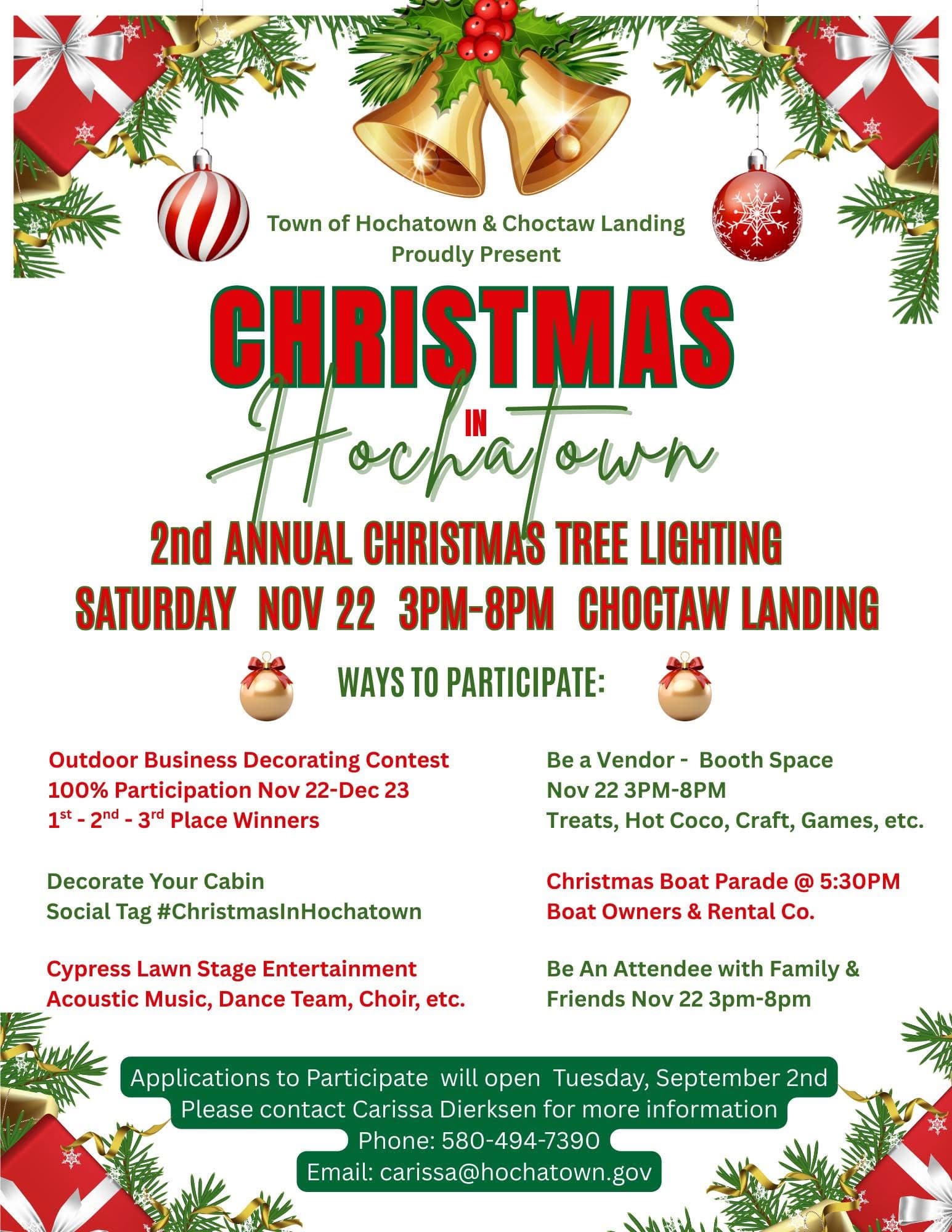 November 22 @ 3:00 pm - 8:00 pm Hochatown Christmas Tree Lighting at Choctaw Landing Choctaw Landing 272 N State Highway 259A, Hochatown, OK, United States