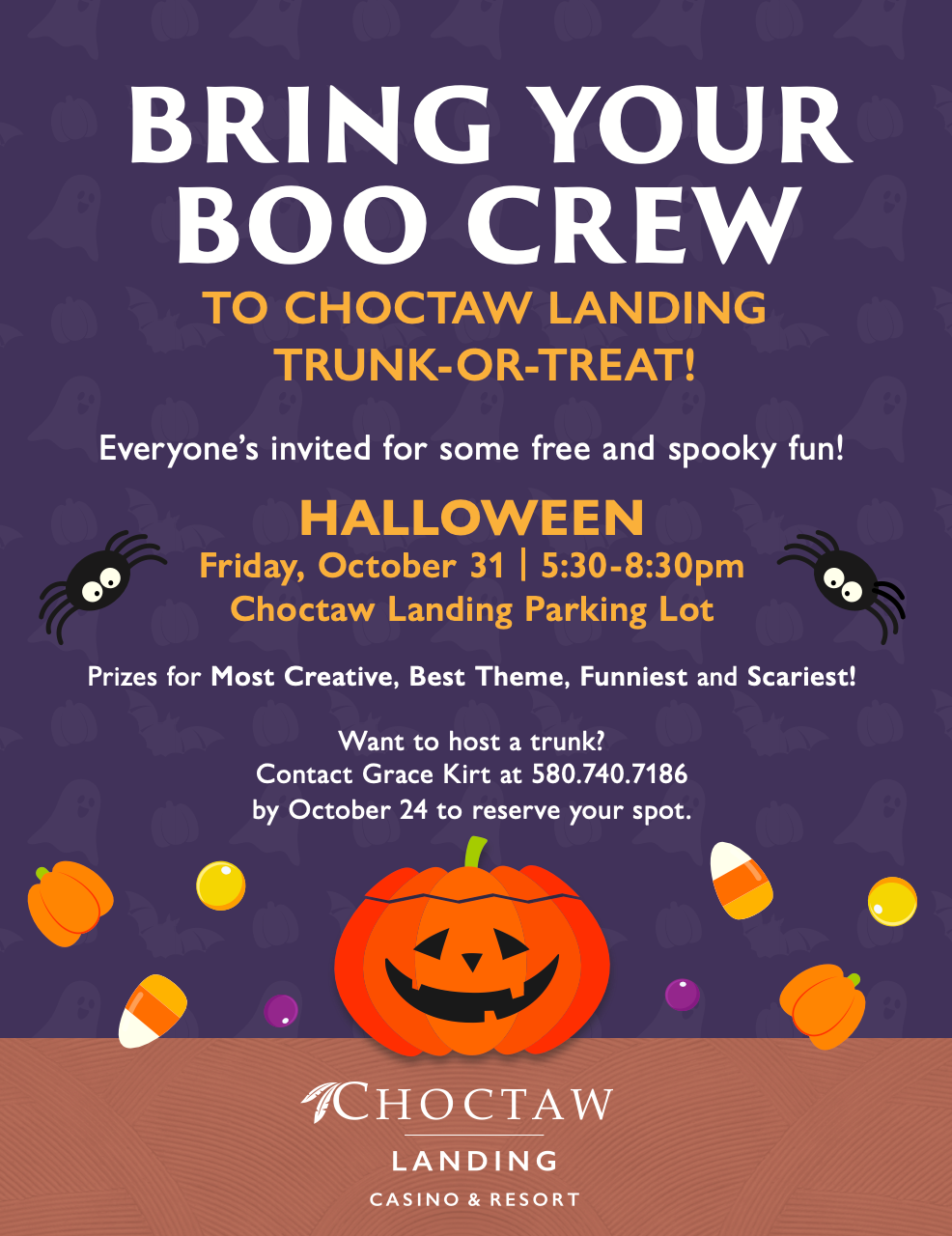 October 31 @ 5:30 pm - 8:30 pm Trunk or Treat @ Choctaw Landing Choctaw Landing 272 N State Highway 259A, Hochatown, OK, United States