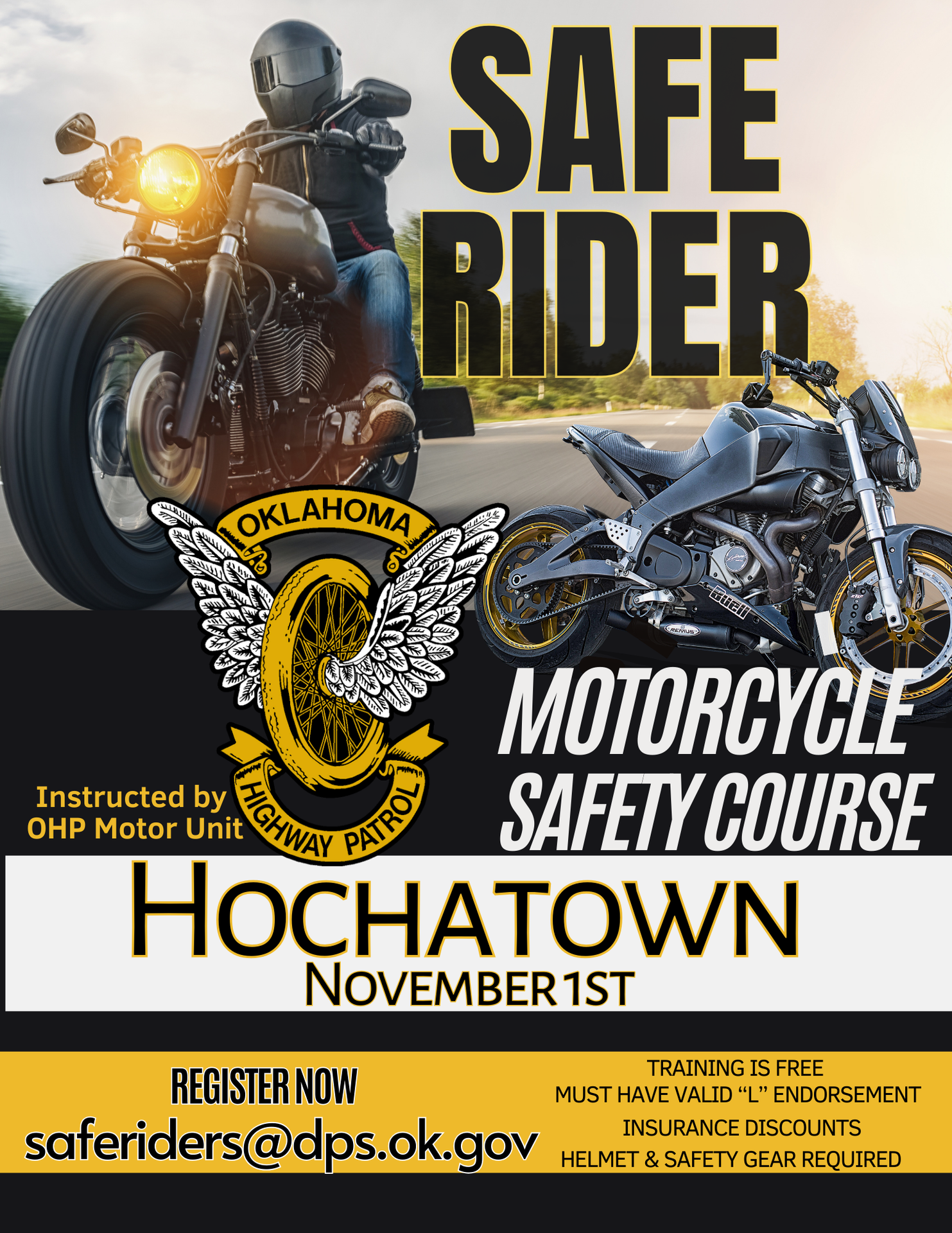 November 1 Safe Rider Motorcycle Safety Course Choctaw Landing 272 N State Highway 259A, Hochatown, OK, United States Held in the Choctaw Landing Parking lot. Register at saferiders@dps.ok.gov